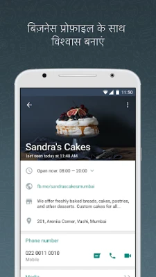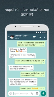 अपनी बिक्री बढ़ाएँ और अपने व्यवसाय का विस्तार करें। लक्षित प्रस्तावों के माध्यम से संभावित ग्राहकों को सीधे आकर्षित करें और "क्लिक-टू-WhatsApp" विज्ञापनों के साथ उन्हें आसानी से अपनी चैट पर लाएँ। अपने उत्पादों और सेवाओं की विस्तृत सूची प्रदर्शित करें और ग्राहकों को ऐप के भीतर ही सुविधाजनक ऑर्डर देने और भुगतान करने की सुविधा प्रदान करें। आप एक ही डिवाइस पर अपने व्यक्तिगत WhatsApp खाते के साथ-साथ WhatsApp Business खाते का उपयोग कर सकते हैं, बशर्ते आपके पास दो अलग-अलग मोबाइल नंबर हों। अपनी पहुँच और सुविधा को अधिकतम करने के लिए अपने खाते से कुल पाँच डिवाइस कनेक्ट करें।
