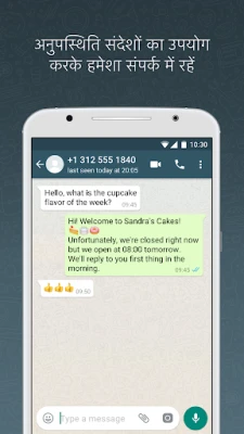 अपनी कार्यक्षमता में सुधार करें और बहुमूल्य समय बचाएँ। स्वचालित त्वरित प्रतिक्रियाओं और अनुपलब्धता संदेशों के साथ ग्राहकों को तुरंत जानकारी प्रदान करें, यह सुनिश्चित करते हुए कि कोई भी व्यावसायिक अवसर छूटे नहीं। महत्वपूर्ण बातचीत को तेज़ी से व्यवस्थित करने, फ़िल्टर करने और खोजने के लिए लेबल का उपयोग करें। विशेष ऑफ़र, नवीनतम समाचार या घोषणाएँ साझा करने के लिए स्टेटस सुविधा का लाभ उठाएँ। एक पेशेवर व्यावसायिक प्रोफ़ाइल स्थापित करके ग्राहकों के बीच अपनी विश्वसनीयता बढ़ाएँ और तत्काल प्रतिक्रियाओं के माध्यम से दीर्घकालिक विश्वास का निर्माण करें। अपनी प्रामाणिकता को और पुख्ता करने के लिए, Meta Verified सदस्यता के साथ अपनी व्यावसायिक पहचान सत्यापित करें।