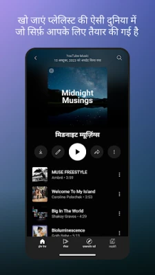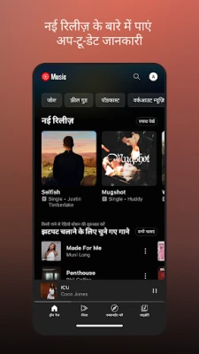 YouTube Music आपके संगीत प्रेम को समझता है। आपके पसंदीदा गानों और कलाकारों को ध्यान में रखते हुए, यह आपके लिए विशेष मिक्स और प्लेलिस्ट तैयार करता है। वर्कआउट से लेकर ध्यान तक, या फिर आरामदायक पलों के लिए—हर गतिविधि के लिए विशेष रूप से डिज़ाइन की गई प्लेलिस्ट उपलब्ध हैं। आप अपनी खुद की पसंद के गानों की प्लेलिस्ट बना सकते हैं, या दूसरे संगीत प्रेमियों के साथ मिलकर एक शानदार संग्रह तैयार कर सकते हैं। आपकी पूरी संगीत दुनिया—पसंद किए गए गाने, जोड़े गए एल्बम, कलाकार और प्लेलिस्ट—आपकी निजी लाइब्रेरी में सुरक्षित और व्यवस्थित है। 'डिस्कवर मिक्स' और 'हाल ही में रिलीज़ हुए मिक्स' के ज़रिए हमेशा नए संगीत की खोज करें। हिप-हॉप, पॉप, जैज़, केपॉप, रॉक जैसी सभी शैलियों और हर मूड (खुशी, सुकून, ऊर्जा, रोमांस) के अनुसार संगीत का आनंद लें। दुनिया भर के सबसे लोकप्रिय गानों को भी यहीं खोजें।